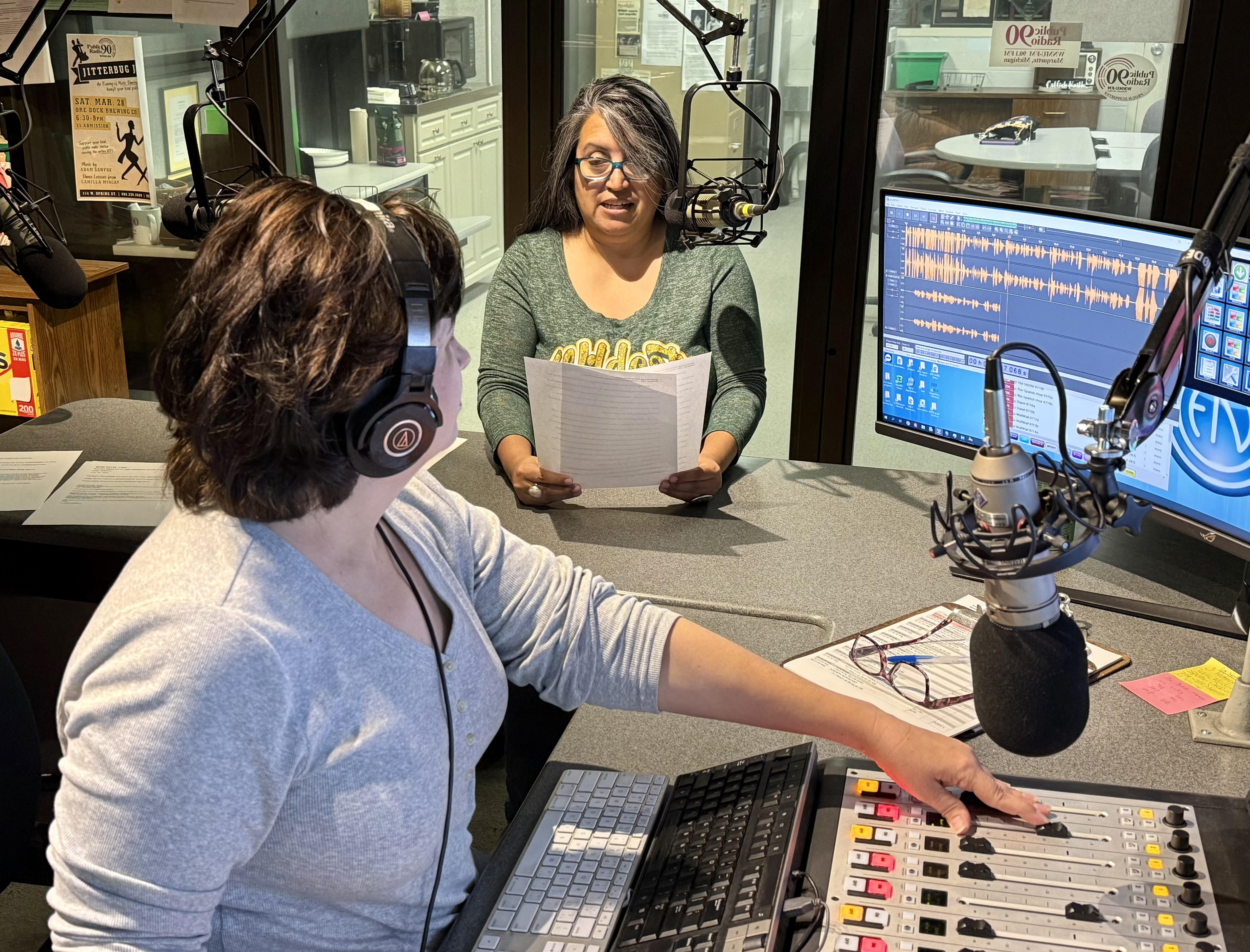 Walton assists Lindala in recording the vignettes in the WNMU-FM studio. They are typically three minutes in length and air on Fridays at 7:30 a.m. and 4:30 p.m.