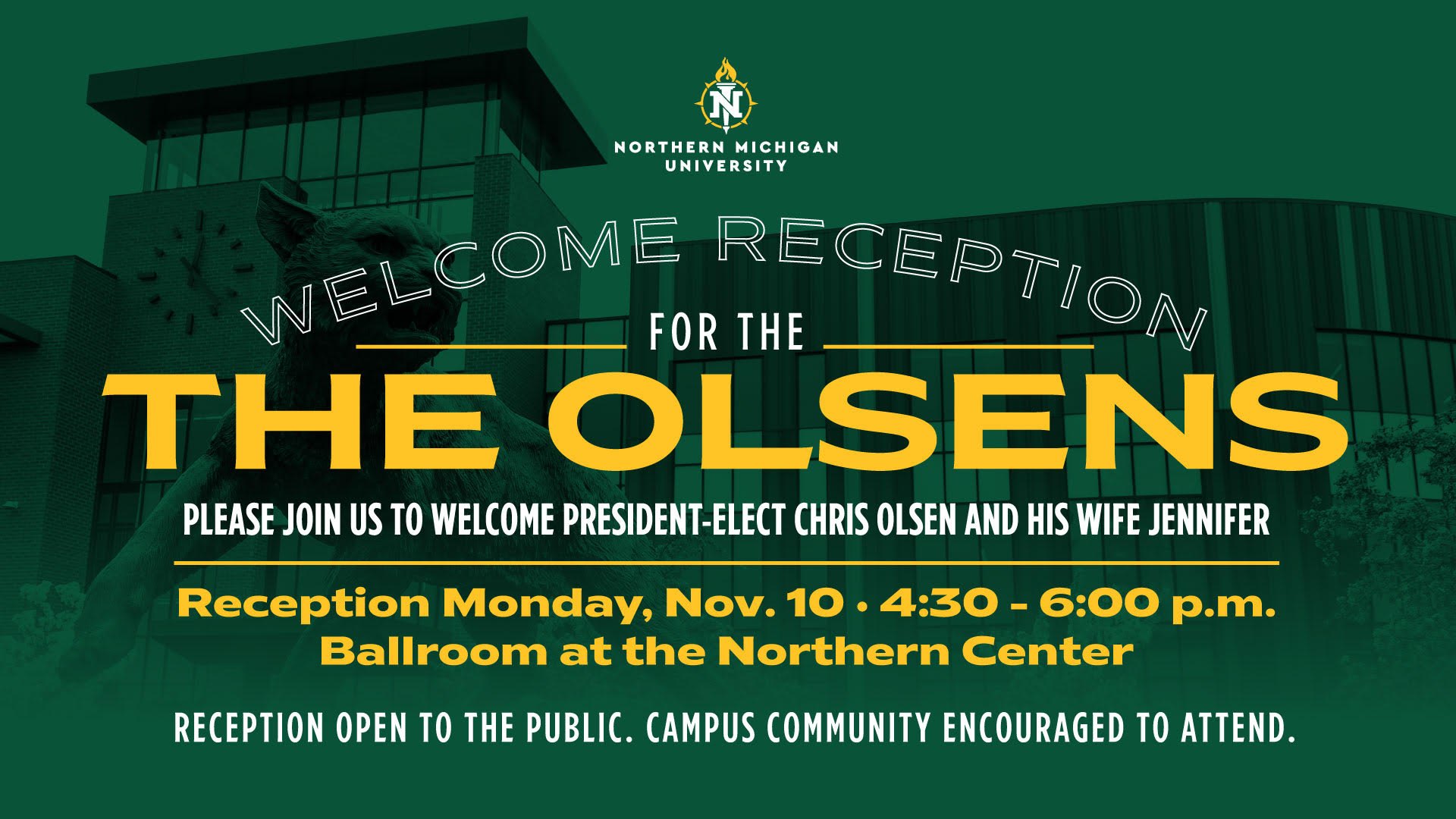 Northern Michigan University will host a welcome reception for incoming NMU President Chris Olsen and his wife, Jennifer. The event is scheduled from 4:30-6 p.m. Monday, Nov. 10, in the Grand Ballroom of the Northern Center. Faculty, staff, students and community members are invited to attend.
