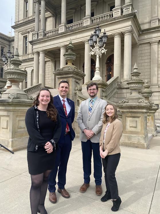 Two Northern Michigan University students and two alumni joined President Brock Tessman in testifying on behalf of NMU before the House Appropriations Subcommittee on Higher Education and Community Colleges in Lansing April 23. Those sharing the impact of their academic journeys were: Emma Gariepy, a senior forensic biochemistry major from Mattawan, Mich.; Ben Klossner, a junior mechanical engineering technology major from Iron Mountain; Troy Morris, a 2016 psychology/behavior analysis graduate and co-founder/CEO of the aerospace and space logistics company Kall Morris Inc. of Marquette; and Lexi Hagan, a 2024 business management graduate and new executive director of the Menominee Business Development Corporation.